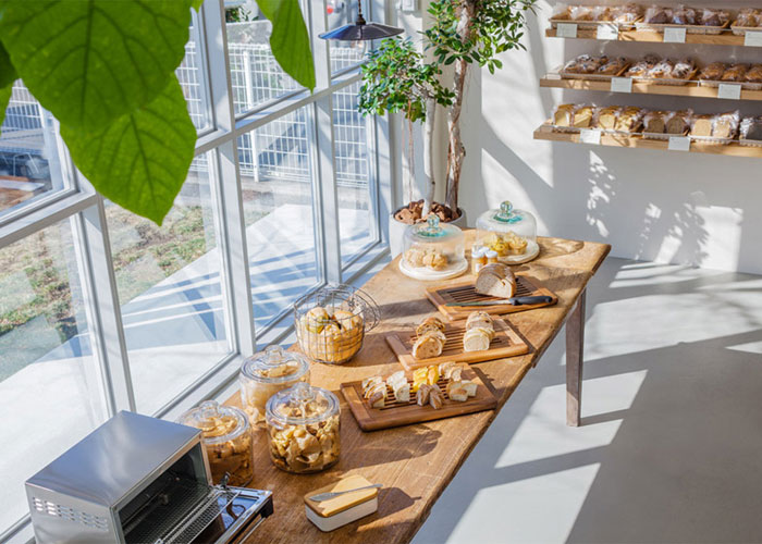 除此之外还有另一项设计重点,即是店内大量采用自然光,店门口大片的方格玻璃窗,让满满的自然阳光透入内边空间,从座位区到放置在木桌上整齐划一的各色面包,与光线交织出令人暖心又食指大动的美丽画面,让闲晃著挑选面包的人们,也能度过一段轻松慵懒的休闲好“食”光。